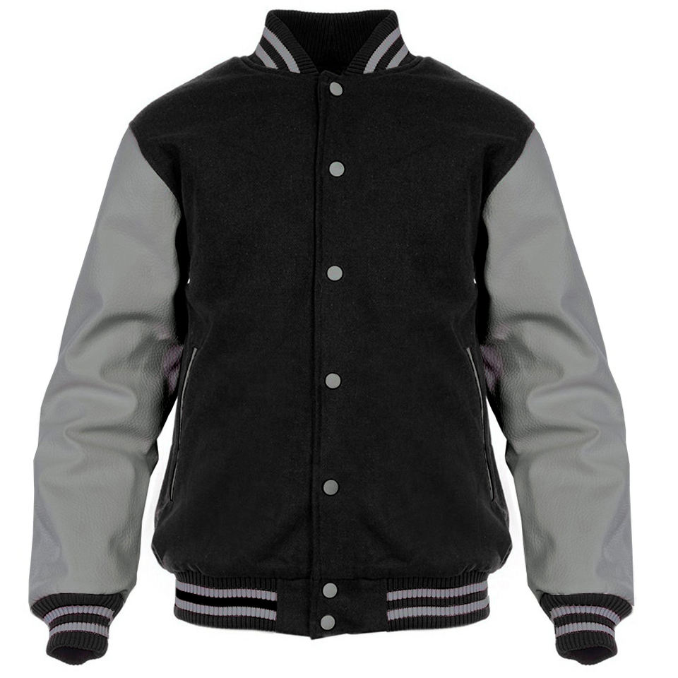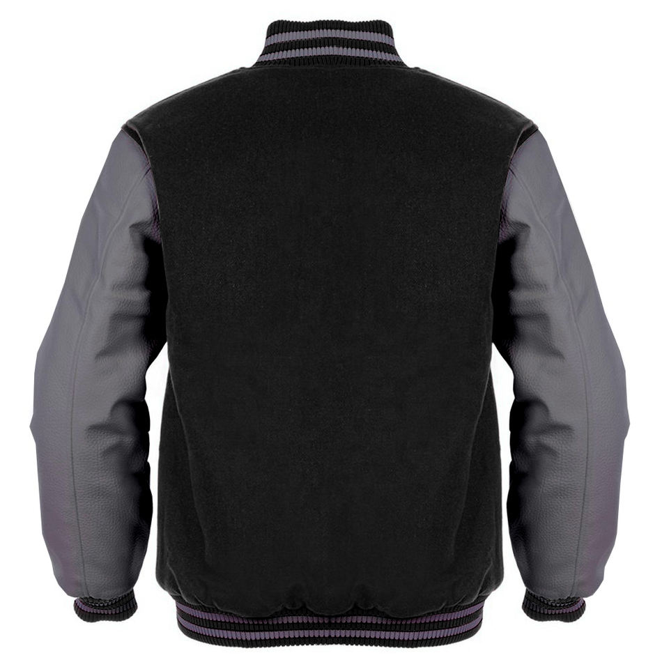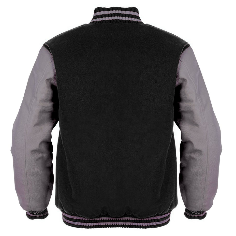 แจ็กเก็ตทีมฟุตบอลสไตล์วิทยาลัยวินเทจพร้อมด้วยตัวเสื้อขนสัตว์สีดำและสีเทาแท้เสื้อแจ็คเก็ตสำหรับผู้ชาย