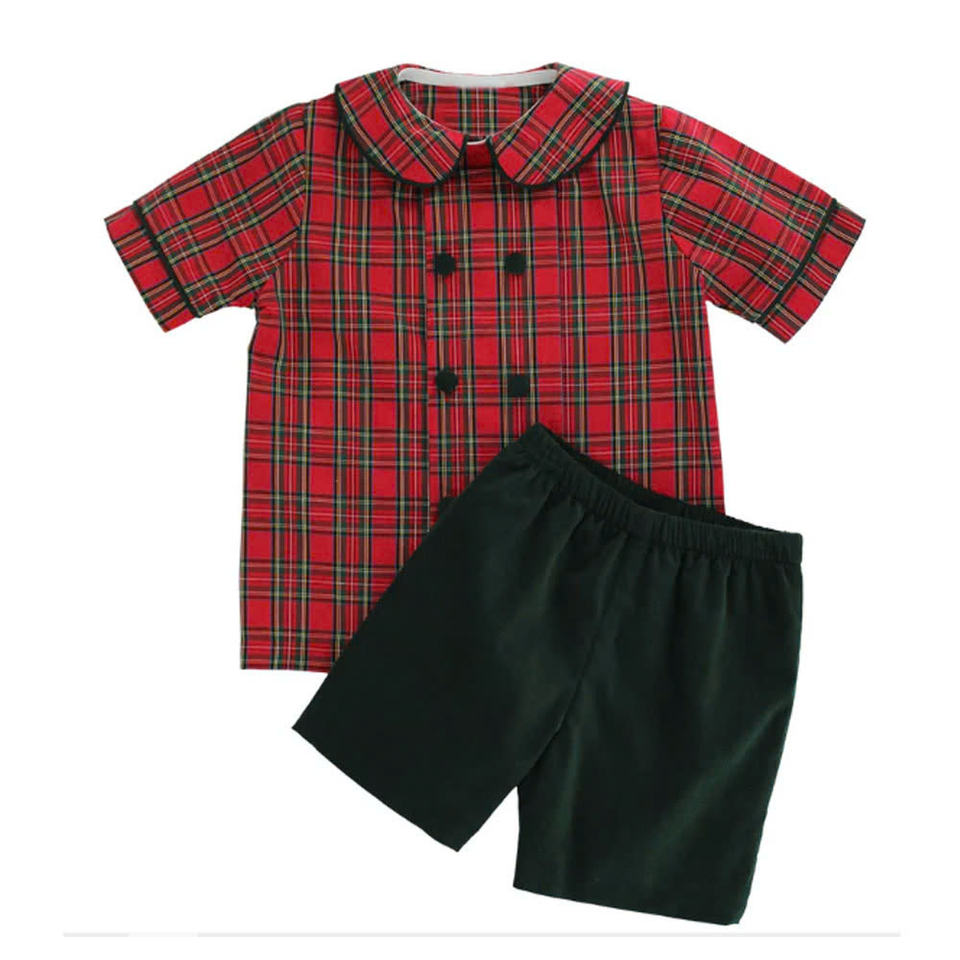 ชุดเสื้อผ้าฝ้ายวินเทจสำหรับเด็กผู้ชายวัยเตาะแตะ ลายสก็อตสีแดงคริสต์มาส พร้อมกางเกงขาสั้นสีดำ บริการ OEM เวียดนาม Spiderkidsvn