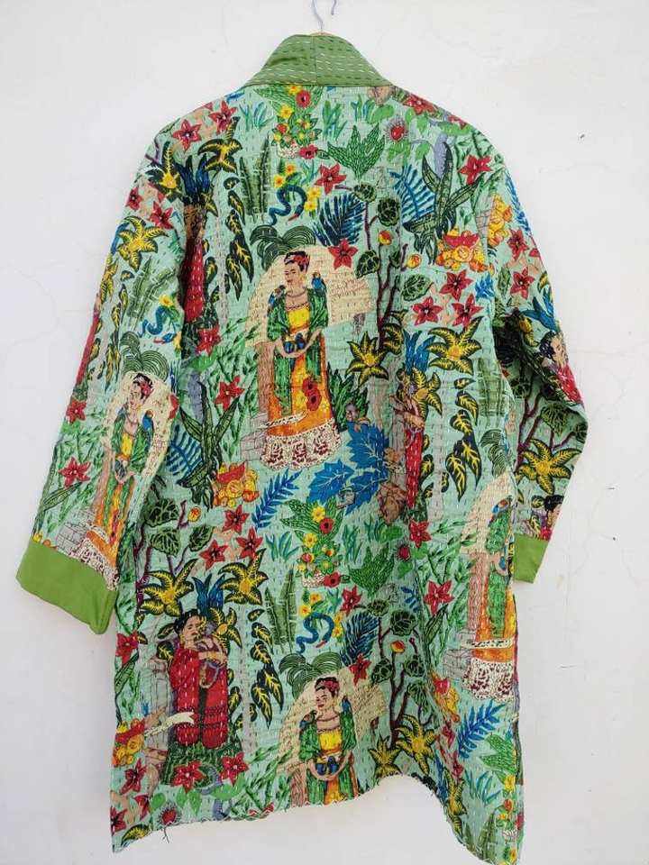 แจ็กเก็ตผ้าฝ้ายสไตล์วินเทจสำหรับผู้หญิงเสื้อคลุมกิโมโน Kantha แบบโบฮีเมียนทำด้วยมือ