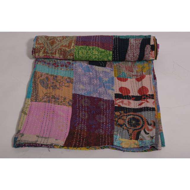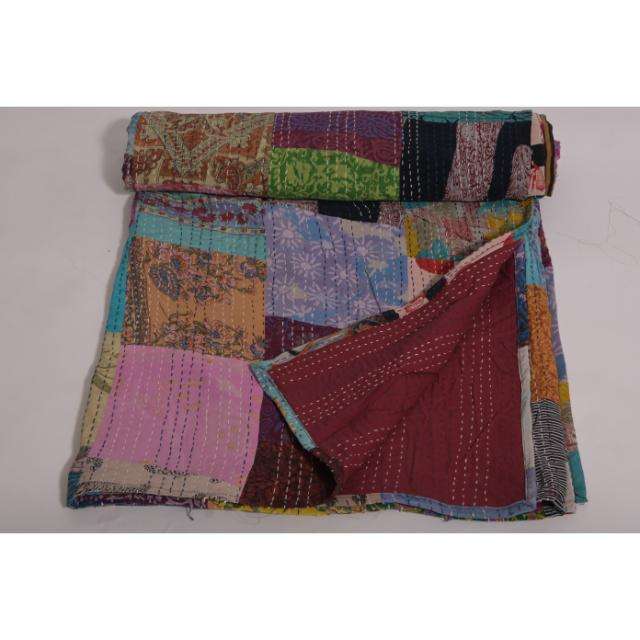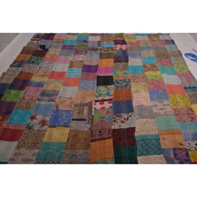 ผ้าห่มควิลท์คันธาผ้าฝ้ายวินเทจลายปะติดปะต่อ ทำมือสไตล์อินเดียโบโฮ ผ้าคลุมเตียงแบบสองด้าน
