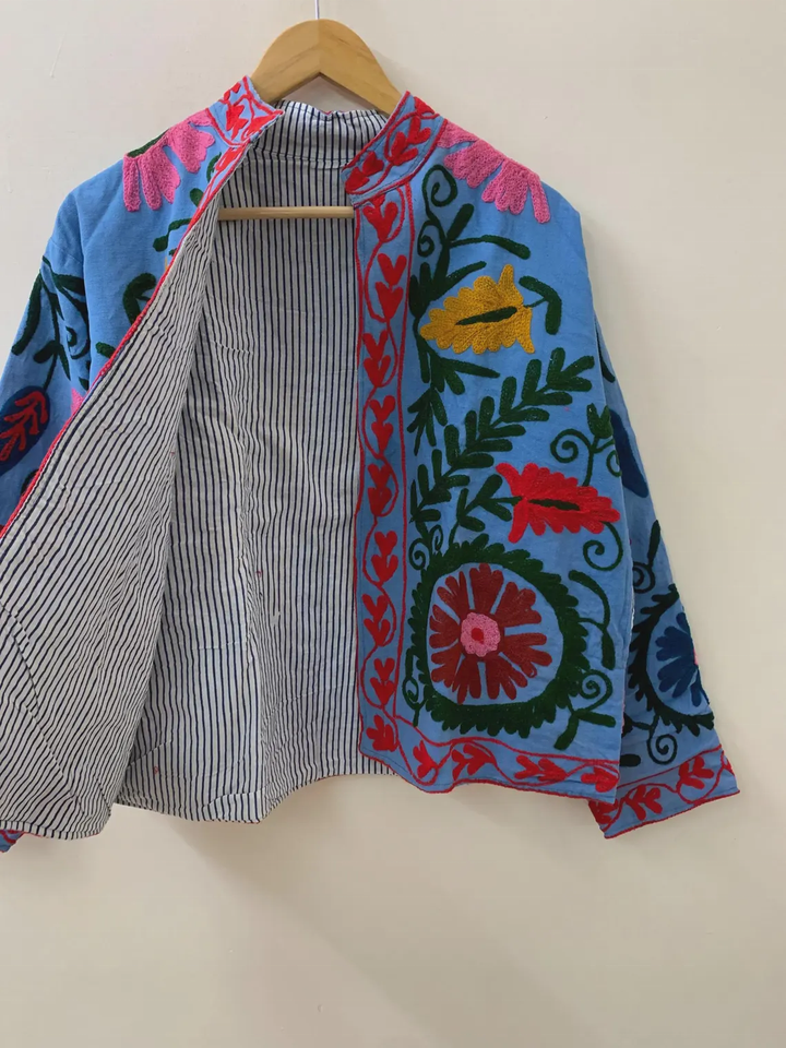 Suzani เสื้อโค้ทผ้าฝ้ายวินเทจแจ็กเก็ตปักลายอินเดียแจ็กเก็ตโบโฮบุผ้าคอตตอน