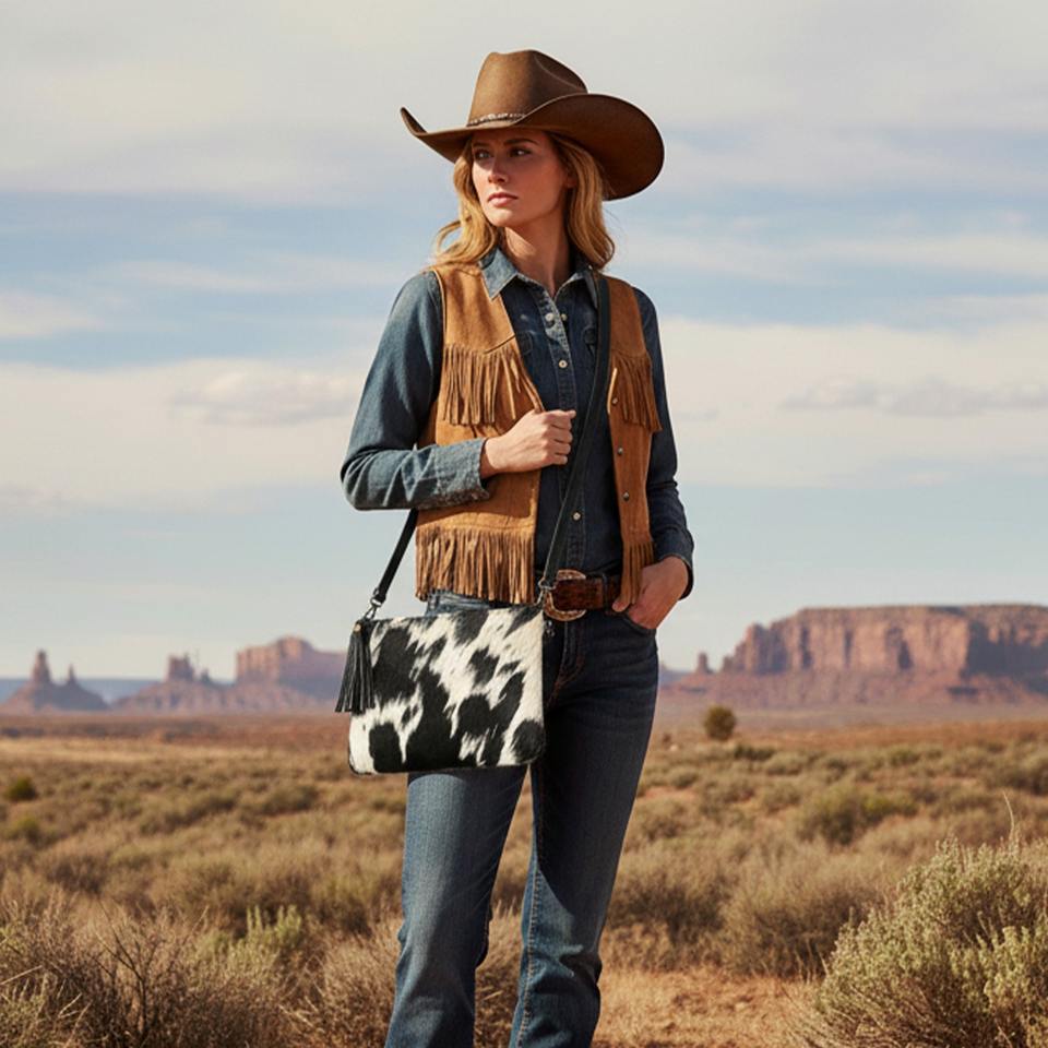 กระเป๋าหนังวัวแท้สไตล์วินเทจแบบสะพายข้างใบเล็กประดับพู่สไตล์ตะวันตก