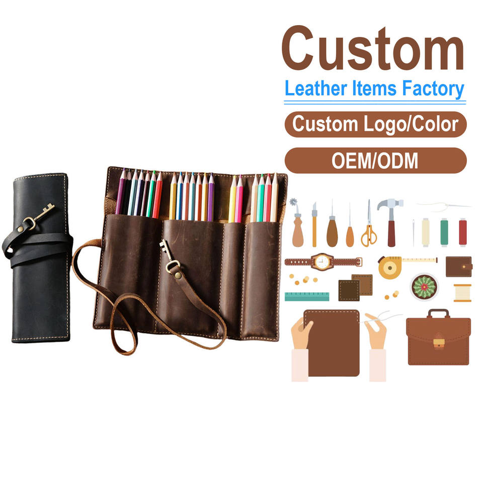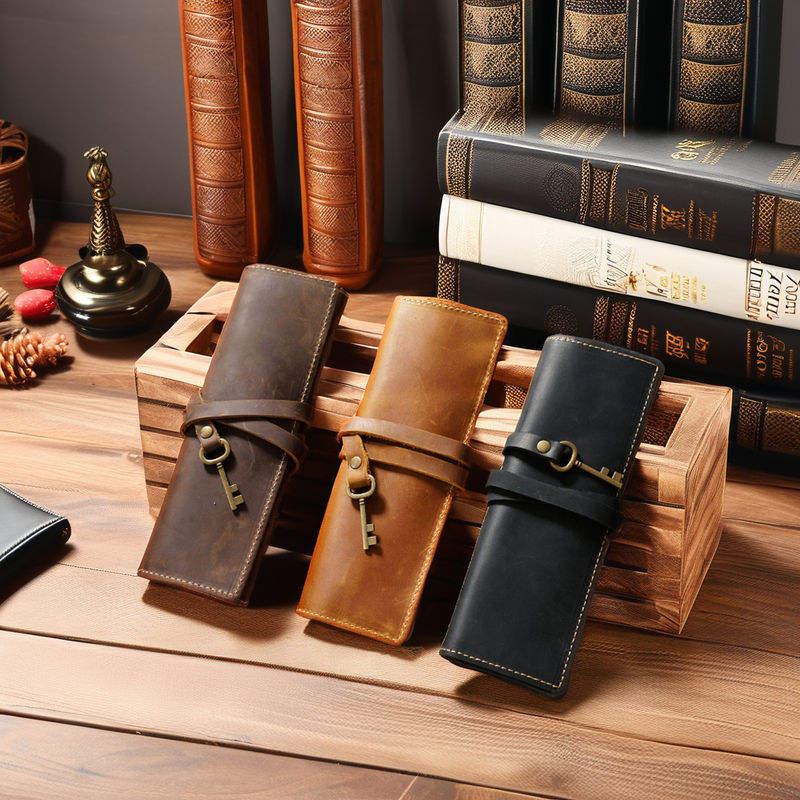 กระเป๋าใส่ดินสอหนังวัววินเทจ หนังชั้นแรก กระเป๋าใส่สีเทียนแบบเรียบง่าย กระเป๋าใส่ปากกาสีสำหรับศิลปะ