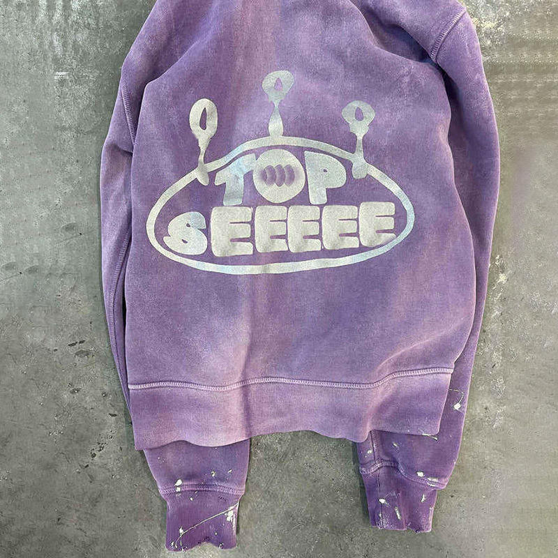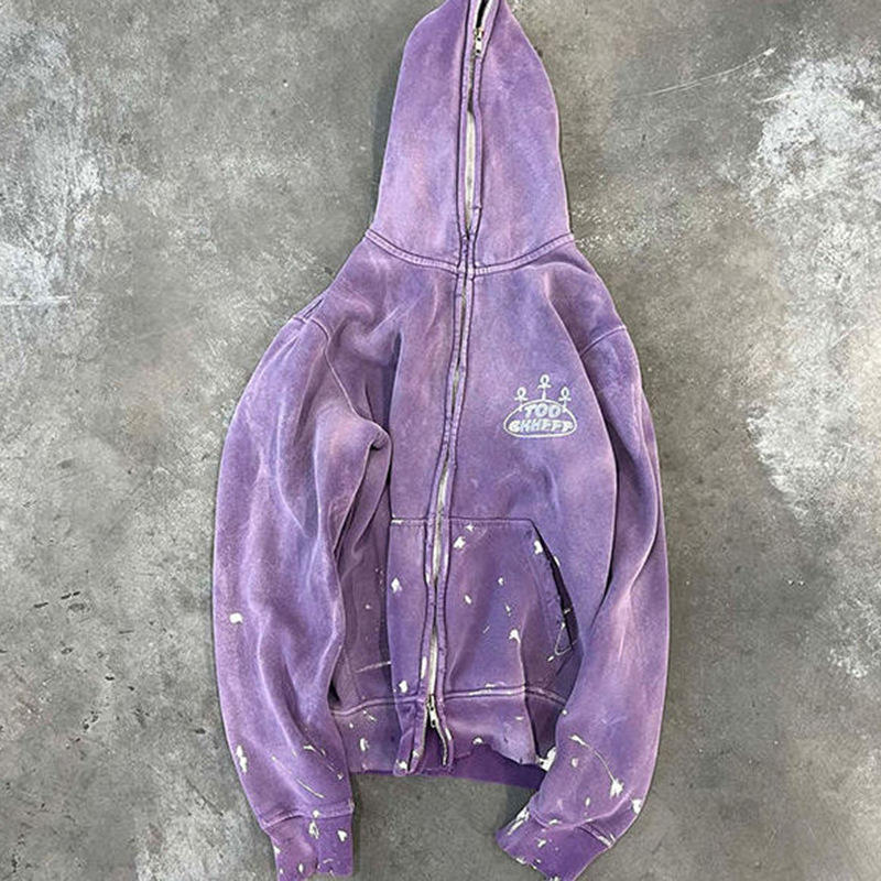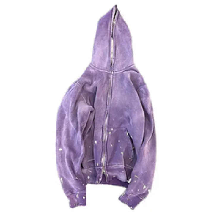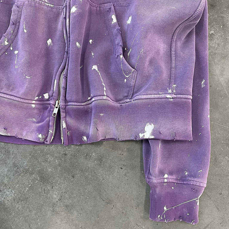 เสื้อฮู้ดดี้ครอปผ้าฝ้ายพิมพ์ลายพ่นสีสไตล์วินเทจ ออกแบบโลโก้ตัวอักษรตามสั่ง ซิปหน้า ลุคฮิปสตรีท ลุคซักฟอก