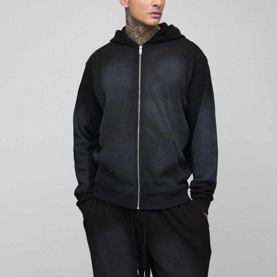 เสื้อมีฮู้ดสำหรับผู้ชายผ้าฟลีซผ้าคอตตอน100% ดีไซน์วินเทจมี500 GSM มีซิปรูดรูดซิปดีไซน์แบบกำหนดเองซักด้วยกรดเสื้อฮู้ดวาฟเฟิลเก็บความร้อน