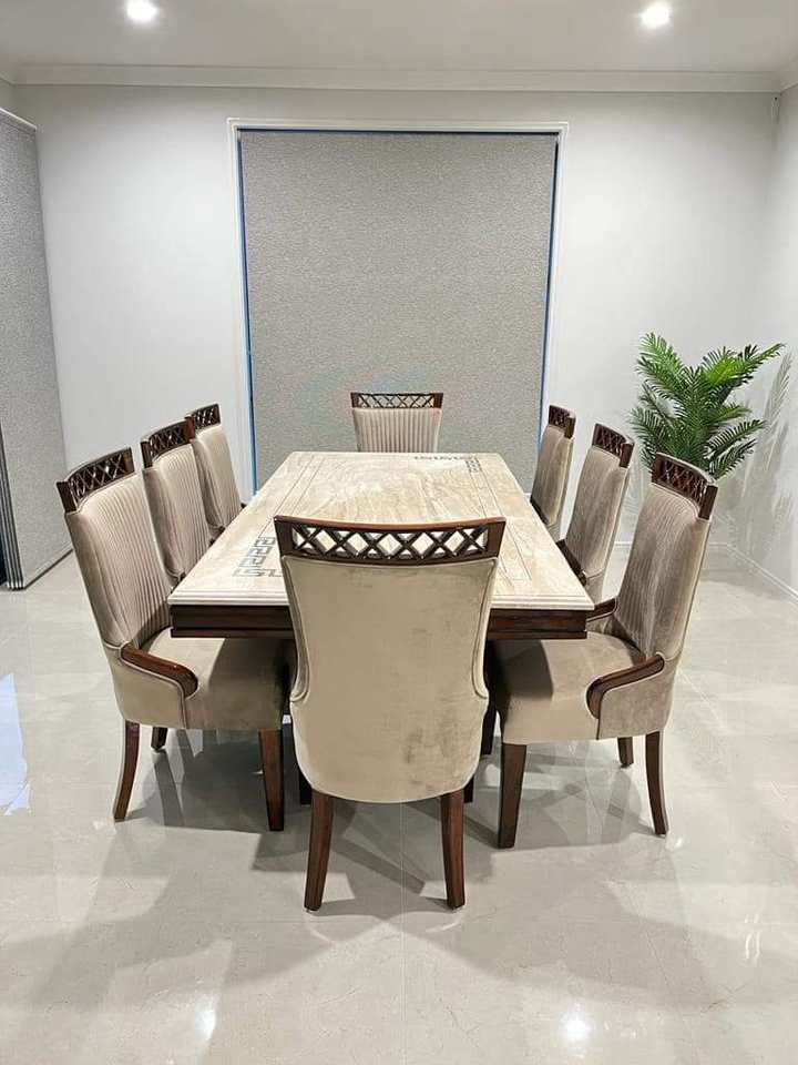 ชุดเฟอร์นิเจอร์ห้องรับประทานอาหารดีไซน์วินเทจ ประกอบด้วยโต๊ะรับประทานอาหารไม้เนื้อแข็งทรงสี่เหลี่ยมทันสมัย พร้อมเก้าอี้เข้าชุด ให้ลุคที่หรูหรา