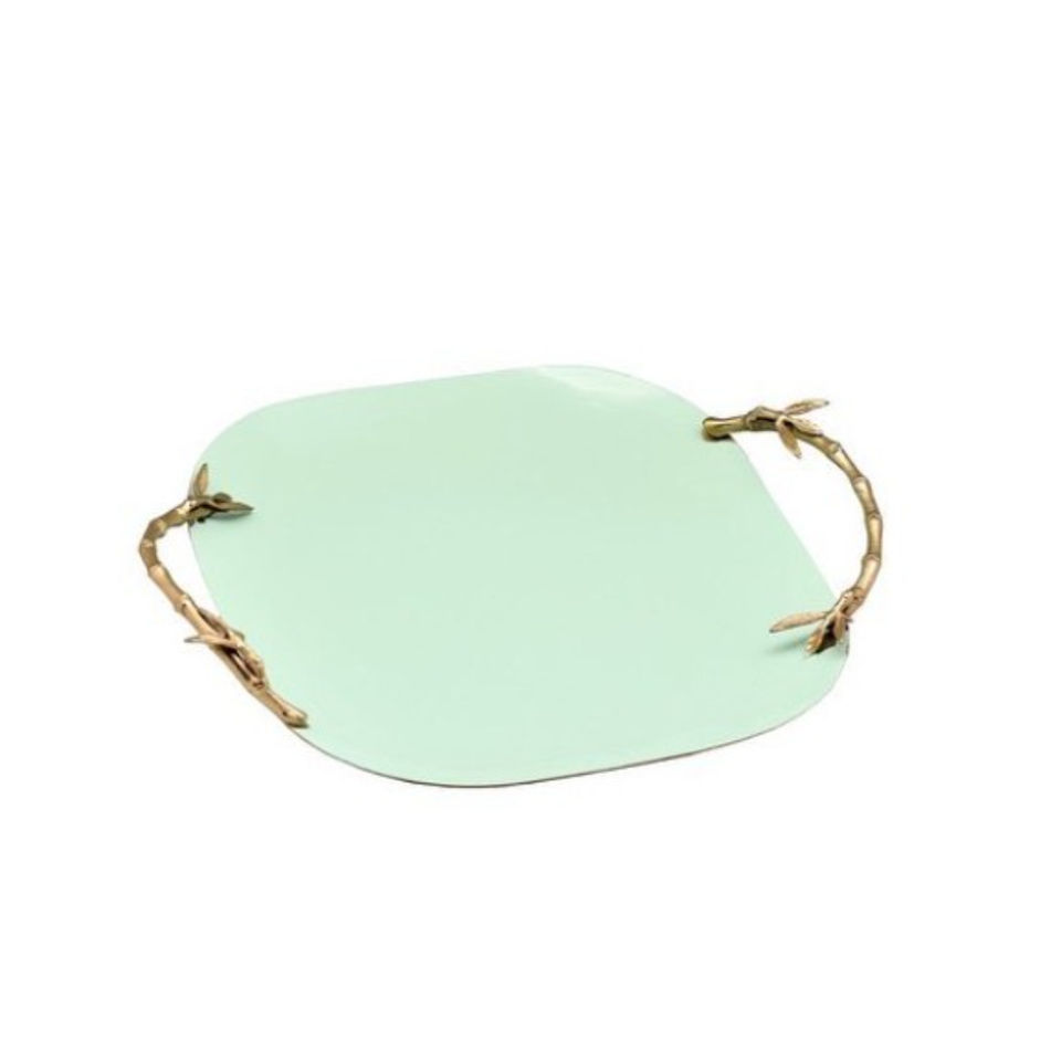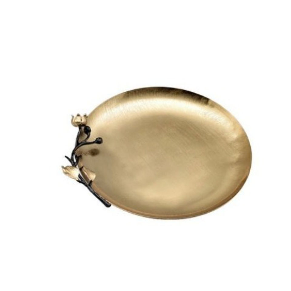 ถาดเสิร์ฟโลหะสีทองดีไซน์วินเทจพร้อมที่จับดอกตูมสำหรับตกแต่งบ้านหรือชิ้นกลางที่สมบูรณ์แบบสำหรับการเสิร์ฟของว่าง