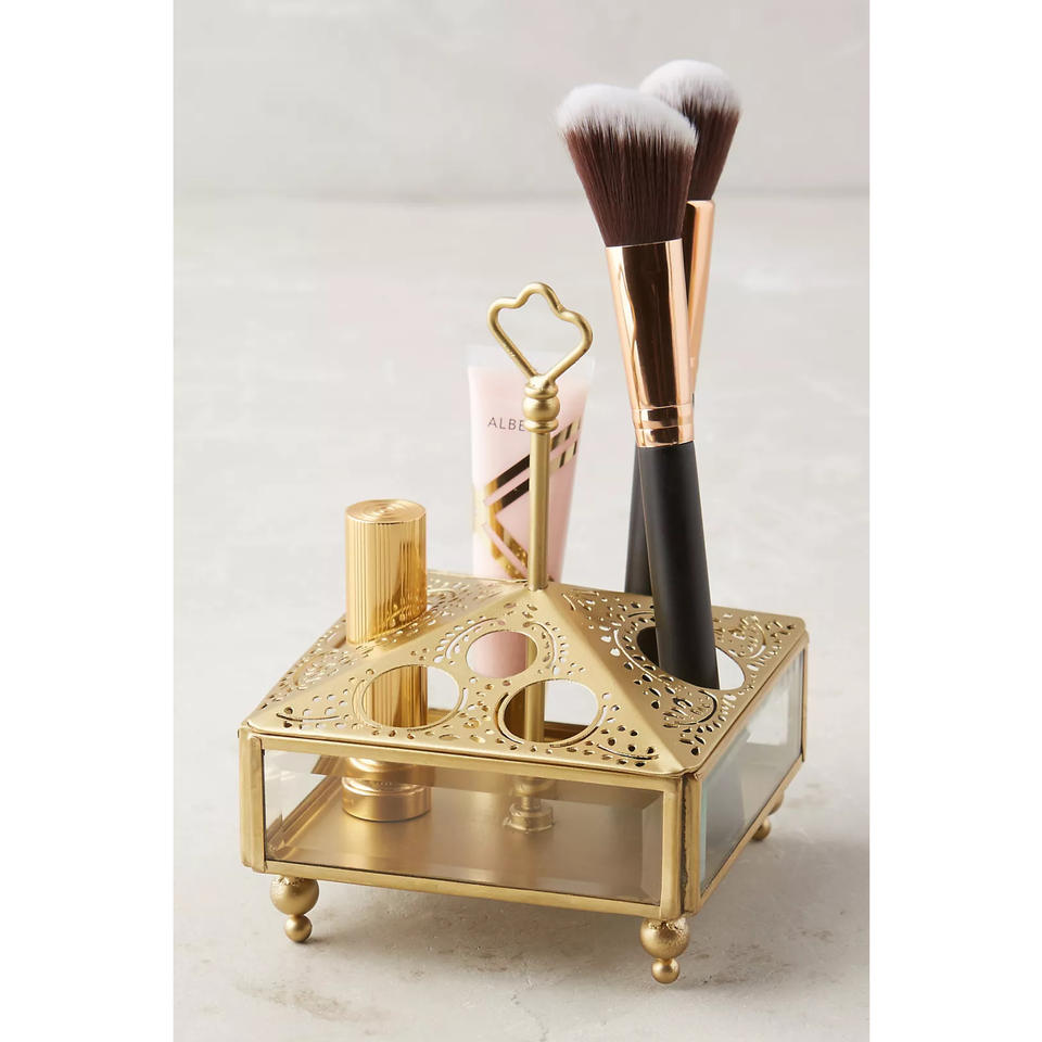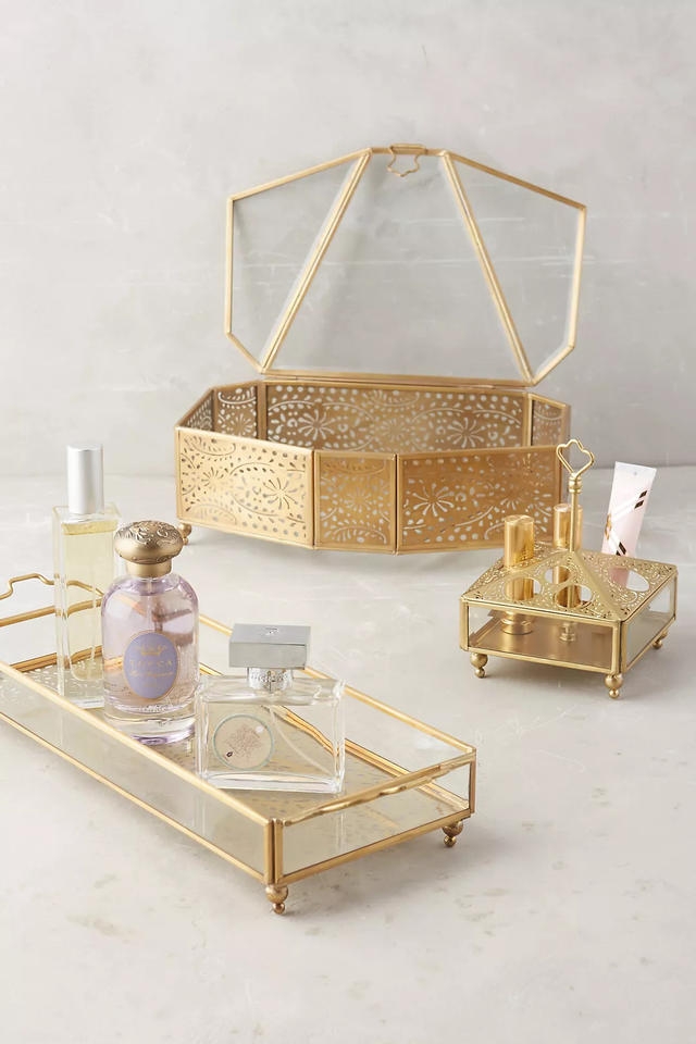 กล่องเครื่องประดับแก้วกรอบโลหะสีทองของดีไซเนอร์วินเทจที่ไม่ซ้ำกันของเมคอัพอัญมณีสำหรับผู้หญิงที่เก็บสร้อยคอ