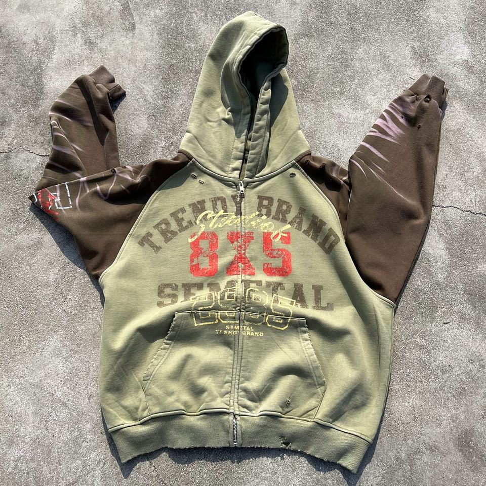 เสื้อฮู้ดดี้วินเทจแบบมีรอยขาด ซิปแบบแร็กแลน พิมพ์ลายสกรีน ผ้าคอตตอนหนานุ่ม ซักแล้ว ทรงโอเวอร์ไซส์ ผ้าเฟรนช์เทอร์รี่ ซิปหน้า
