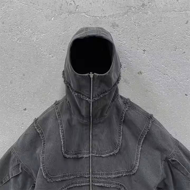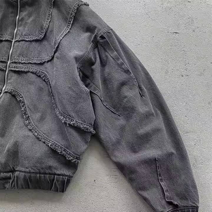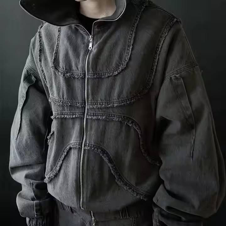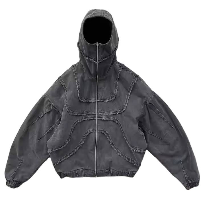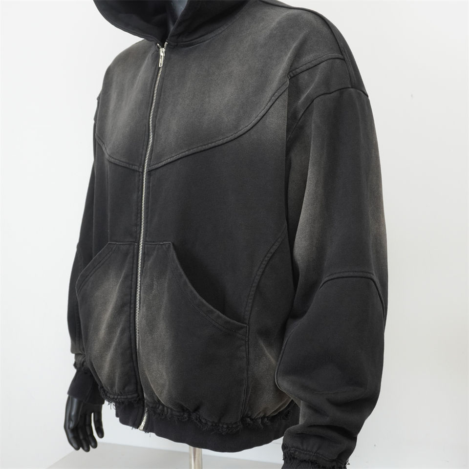 Vintage Distressed Men's Acid Wash French Streetwear Hoodie Custom Rhinestone Embroidery Patch Logo 100% Cotton Zippered Hoodies