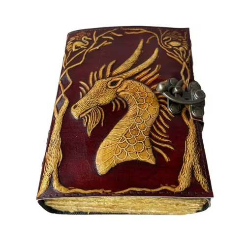 สมุดบันทึกปกแข็งสีเหลืองลายมังกรโบราณ ทำจากหนังแท้ พร้อมลายสัตว์ในสไตล์ตำนาน เหมาะเป็นของขวัญเครื่องเขียนสุดพิเศษ