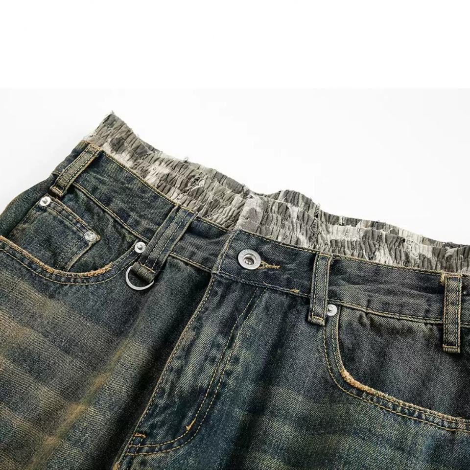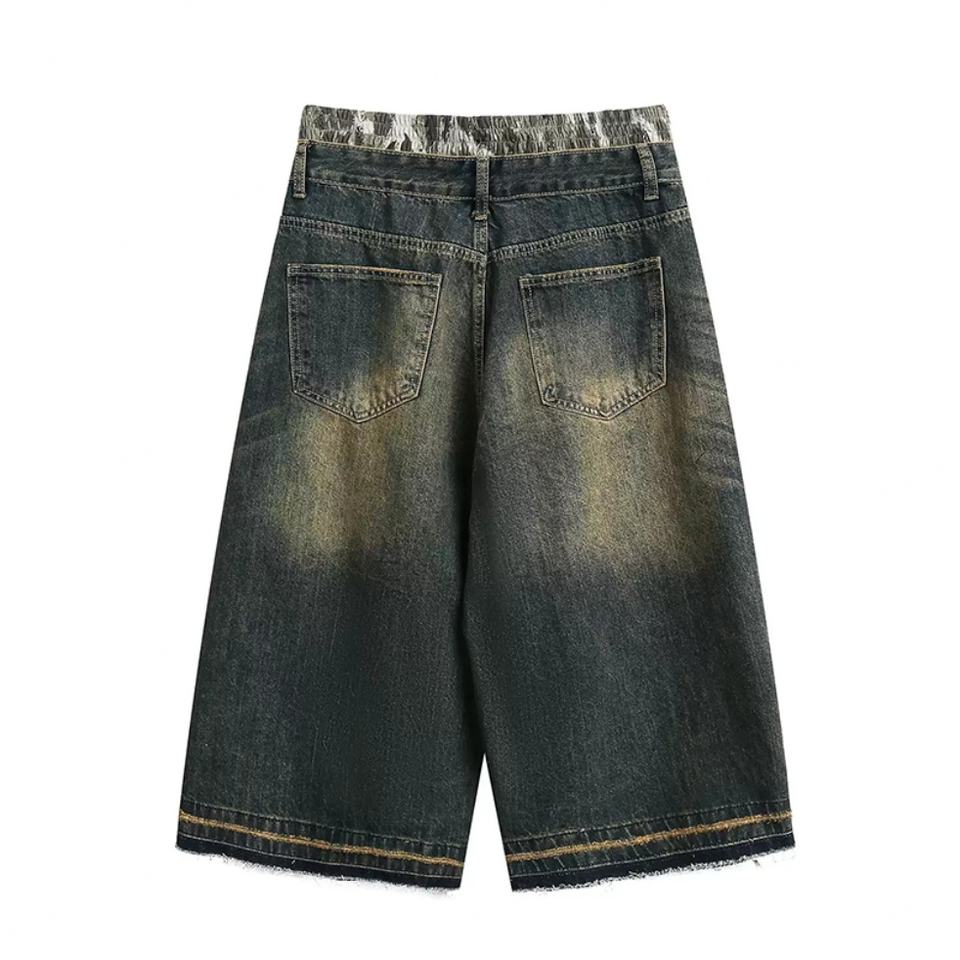กางเกงยีนส์ขาสั้นดีไซน์เนอร์สไตล์วินเทจฟอกสีแบบแพทช์เวิร์ค แต่งพู่ชายกว้างทรงเบอร์มิวดาสำหรับผู้ชาย
