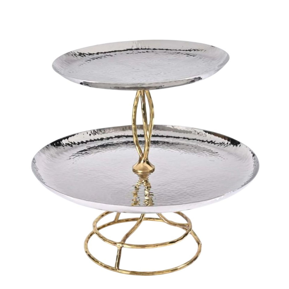 ชั้นวางผลไม้ 2 ชั้น ลายดอกไม้สไตล์วินเทจ ชั้นวางเค้กโลหะ ตกแต่งห้องครัวและห้องรับประทานอาหาร ผิวสีทอง งานแฮนด์เมด สำหรับโชว์ขนมหวาน