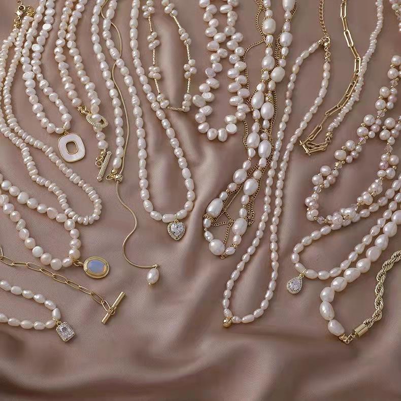 สร้อยคอสไตล์วินเทจแบบฝรั่งเศส บาร็อค ดีไซน์ไม่สมมาตร ประดับมุกน้ำจืดและเพทาย สไตล์ยุโรป-อเมริกัน สร้อยคล้องเสื้อแบบมุก