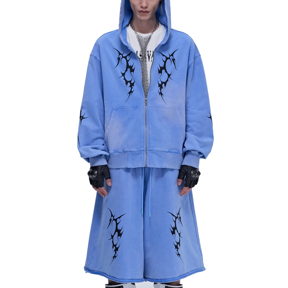 ชุดเซ็ตวินเทจเฟรนช์เทอร์รี่ผ้าฝ้าย 100% เสื้อฮู้ดซิปโอเวอร์ไซส์ กางเกงขาสั้นทรงหลวม ซักแบบแซนด์วอช ชุดกีฬา เอวยางยืดกว้าง เป็นมิตรต่อสิ่งแวดล้อม พิมพ์ลายสกรีน