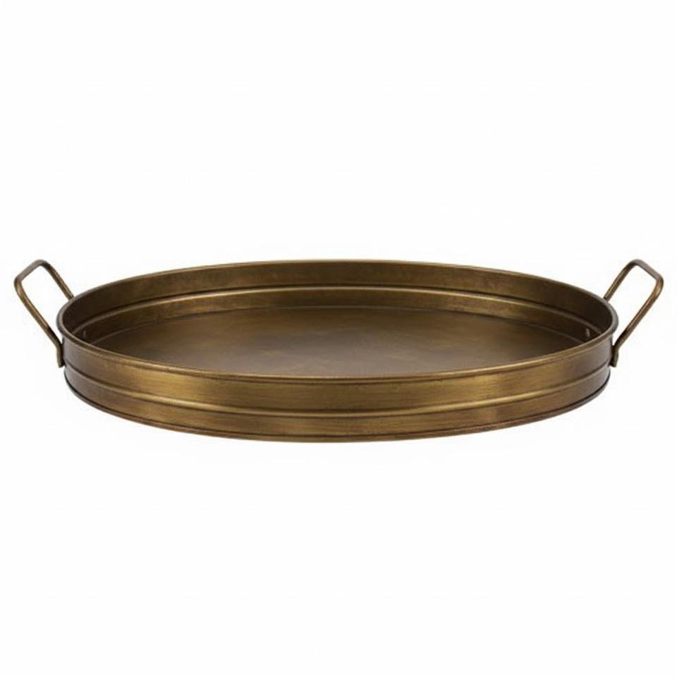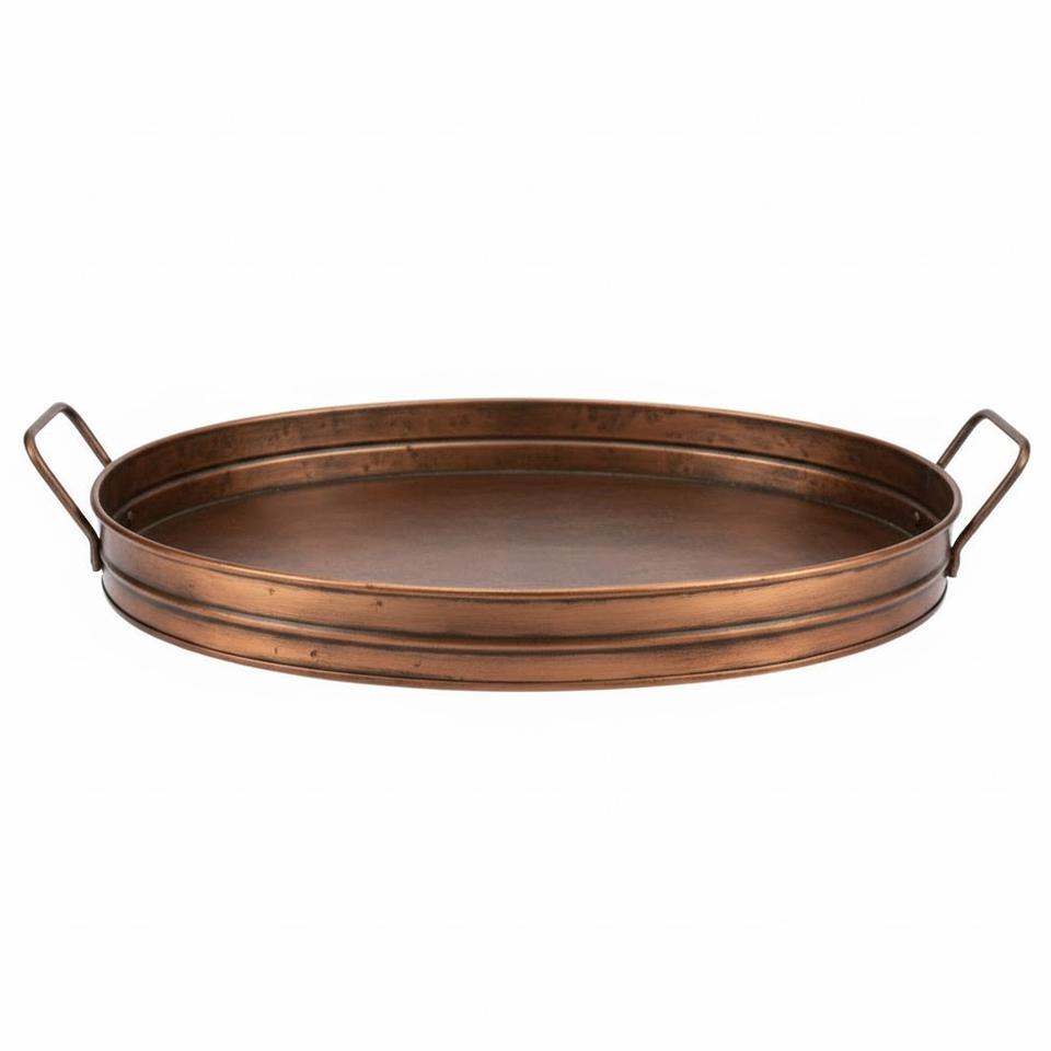 ถาดเสิร์ฟทรงรีโบราณทำจากทองแดงชุบสังกะสีแบบวินเทจ พร้อมหูจับ ตกแต่งสำหรับใช้ในครัวและโต๊ะอาหาร