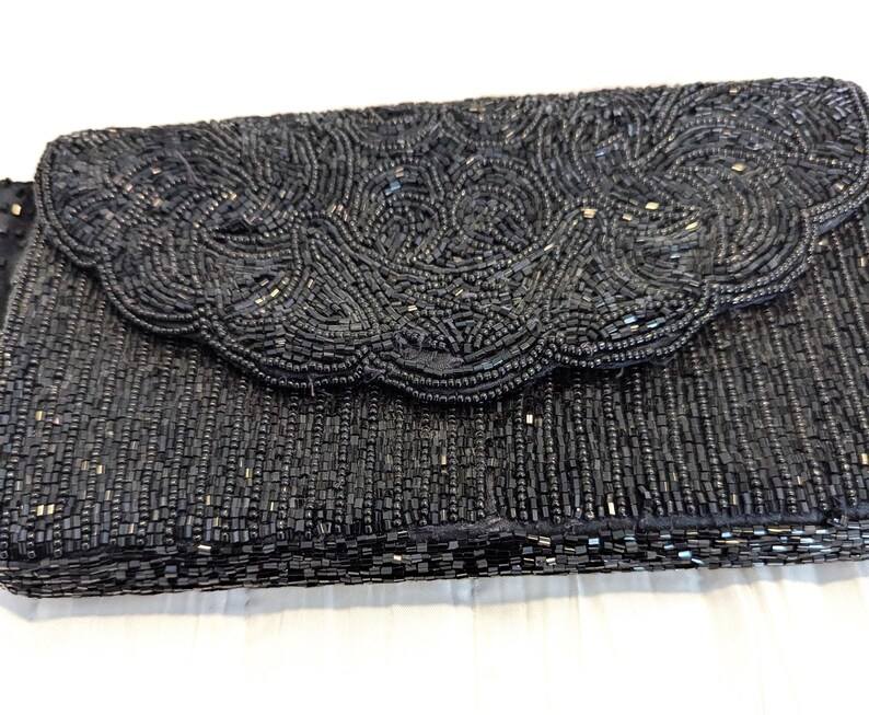 กระเป๋าทรงซองจดหมายประดับลูกปัดแก้วแนววินเทจสีดำดีไซน์สวยน่าทึ่งสำหรับงานเลี้ยงค็อกเทลยามเย็น