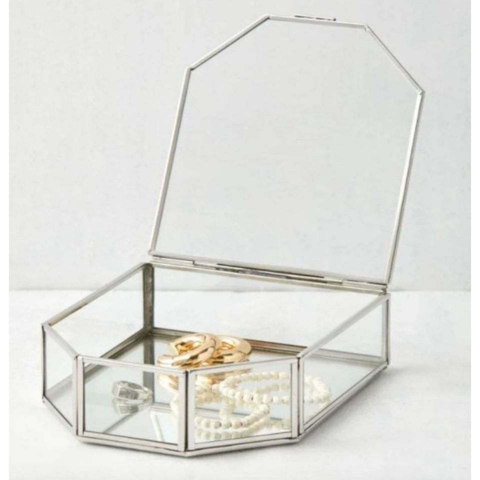 กล่องใส่เครื่องประดับแก้ววินเทจ คุณภาพสูง กล่องแก้วใสและโลหะ พร้อมฝาปิดแบบมีบานพับ กรอบโลหะสีดำลายเรขาคณิต สำหรับจัดเก็บ