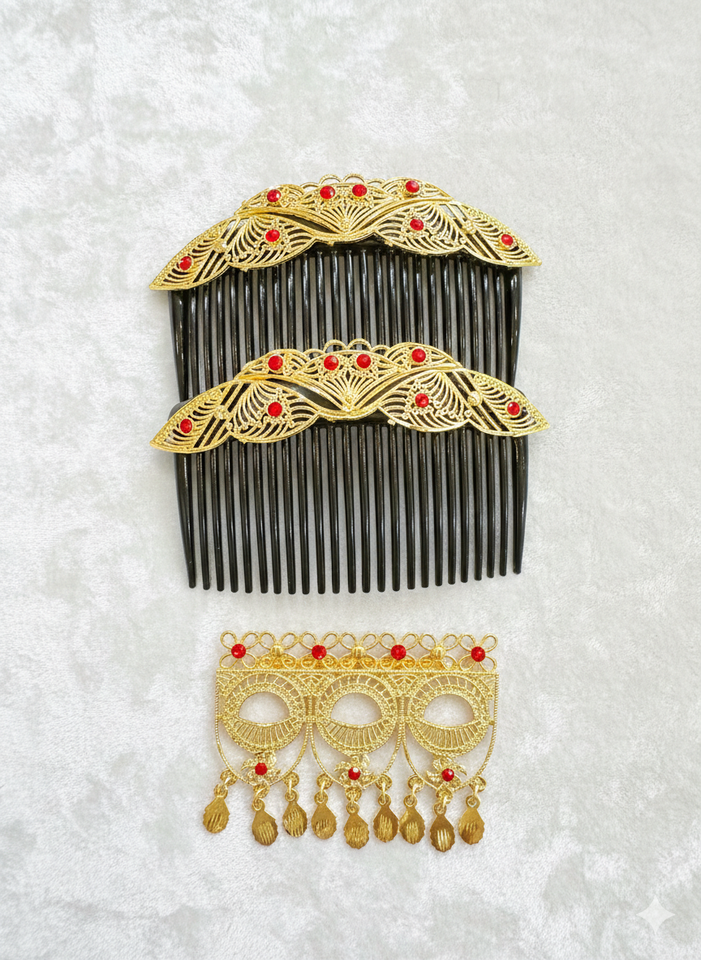 หวีผมทำมือชุบทองวินเทจ รักษ์โลก กันน้ำ ดีไซน์หรูหราทันสมัย ประดับเปลือกโลหะผสม มินิ ประดับด้วยหินสีแดงรูปดอกไม้ สำหรับเจ้าสาว