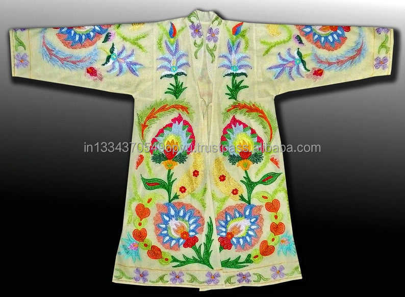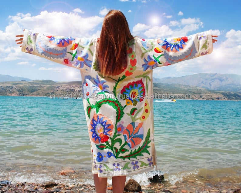 เสื้อคลุมไหมตุรกีปักลายวินเทจสวยงาม เสื้อคลุมอุซเบกสำหรับผู้หญิง ผ้าคลุมชายหาดสุดวิเศษ ชุดคลุมแบบคาฟตันจากอินเดีย