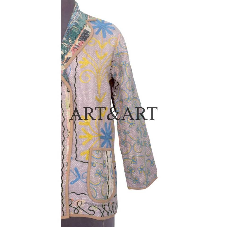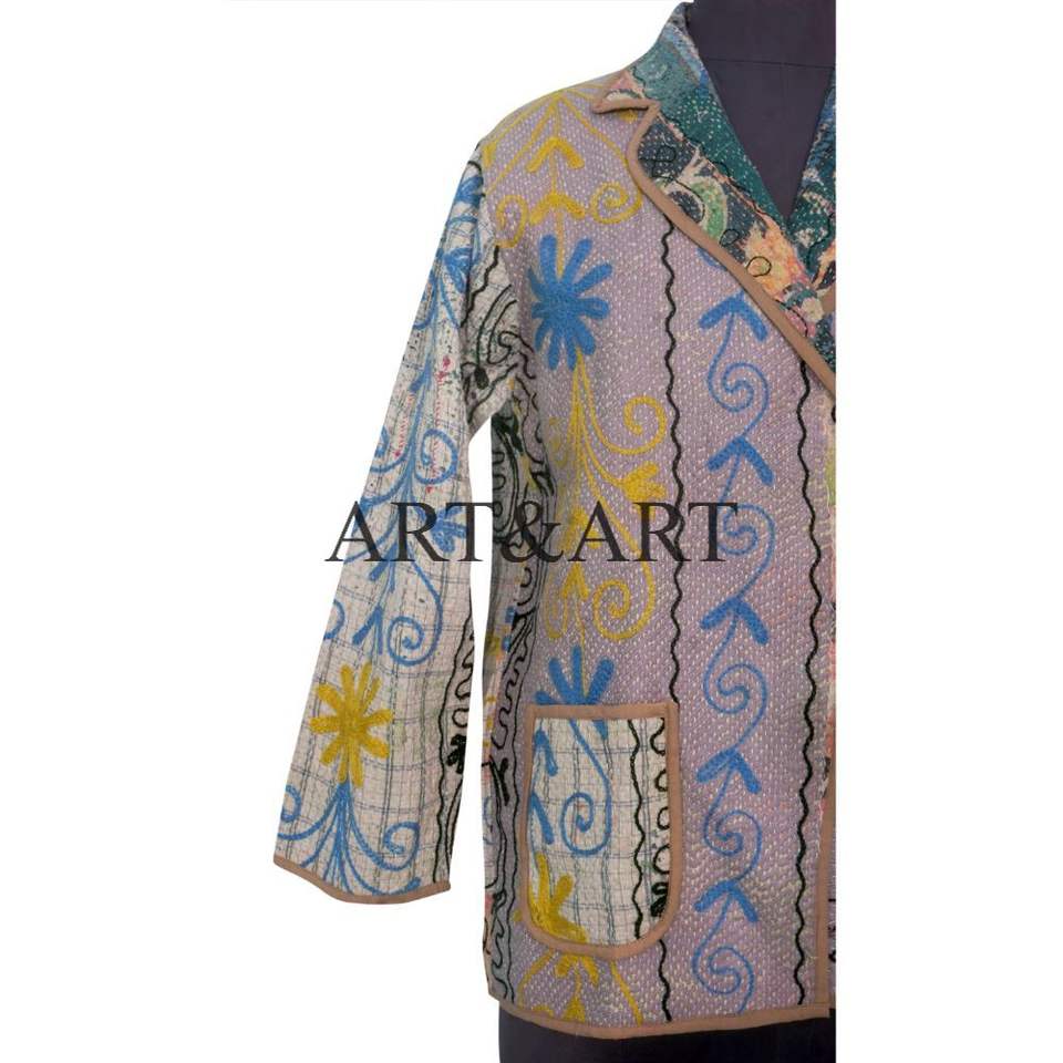 เสื้อแจ็คเก็ตผ้าฝ้ายถักมือสไตล์วินเทจสำหรับผู้หญิง งานฝีมือแบบคันธา เหมาะสำหรับใส่ลำลองในฤดูหนาว ตกแต่งด้วยงานปะติดปะต่อ งานควิลท์ และงานปัก เป็นมิตรกับสิ่งแวดล้อม สามารถใส่ได้สองด้าน