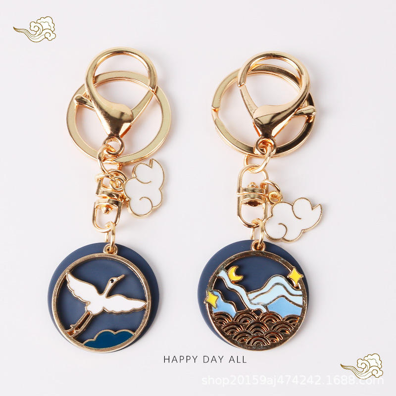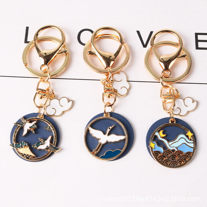 พวงกุญแจรูปคลื่นสีขาวรูปนกกระเรียนทำด้วยมือแนววินเทจเครื่องประดับจี้โลหะผสม