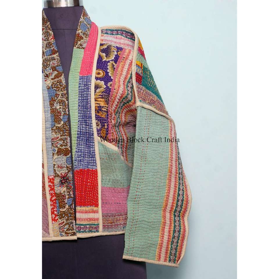 เสื้อแจ็คเก็ตคันธาทำมือสไตล์วินเทจสำหรับผู้หญิง แขนยาว คอวี ผลิตจากผ้าฝ้ายอินเดียถักทอแบบเป็นมิตรต่อสิ่งแวดล้อม ปักลาย ตกแต่งด้วยงานปักมือ เหมาะสำหรับฤดูใบไม้ร่วงและฤดูหนาว