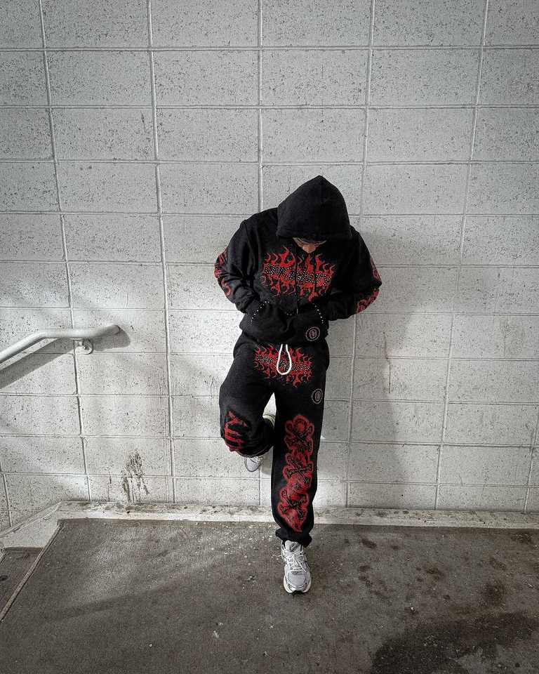 ชุดวอร์มผ้าฝ้ายฟอกสีแบบหนา ซิปยาว ทรงบาน พร้อมเสื้อฮู้ดพิมพ์ลาย DTG และกางเกงขายาวสำหรับผู้ชาย