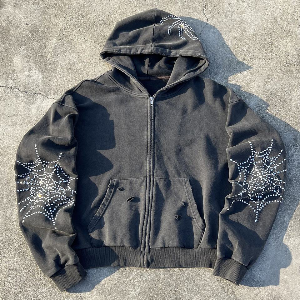 เสื้อฮู้ดดี้วินเทจทรงหลวมสไตล์ Y2K ผ้าเฟรนช์เทอร์รี่ฟอกสี ซิปหน้า แต่งคริสตัล