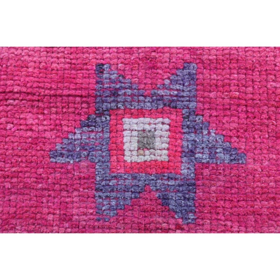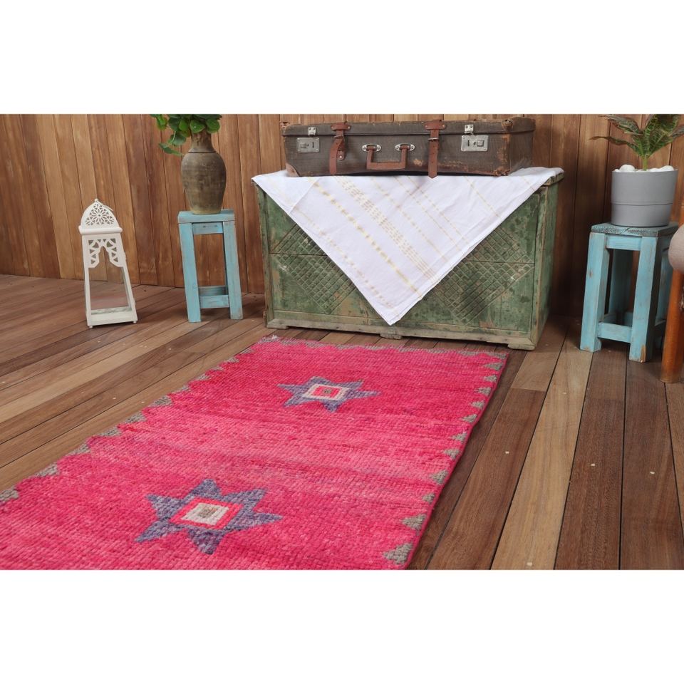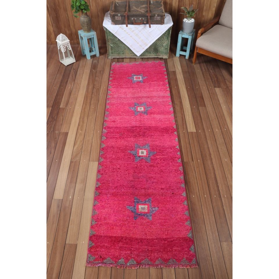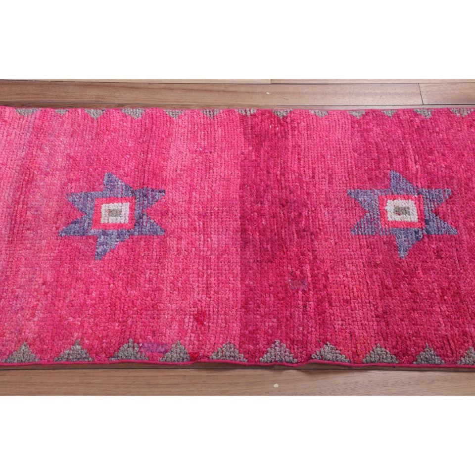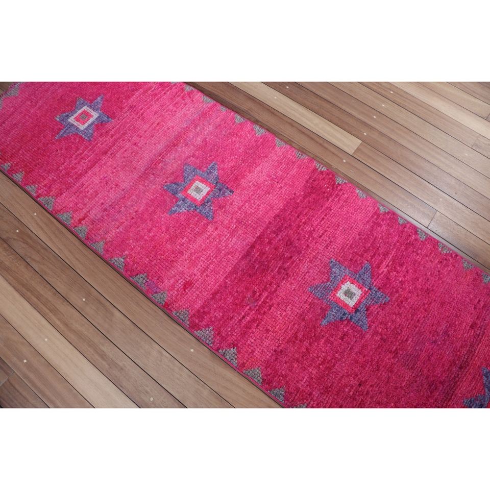 พรมวินเทจ Herki ขนาดเล็ก 2.6x9 ฟุต (80x273 ซม.) พรมลายเรขาคณิตสีชมพูแบบตุรกี
