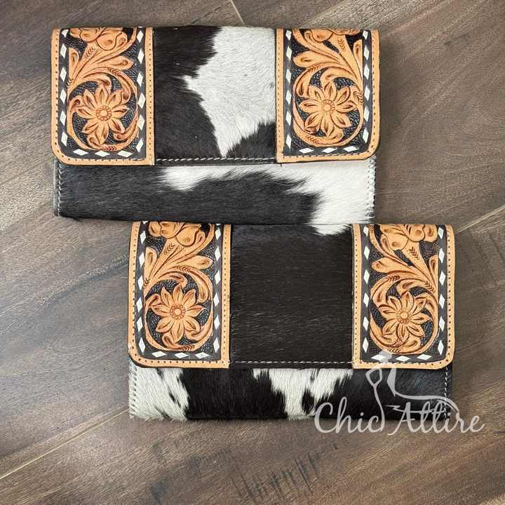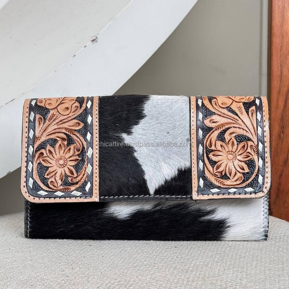 กระเป๋าสตางค์หนังวัวคุณภาพสูงสำหรับผู้หญิงวินเทจหนังวัวลายดอกไม้ใส่ได้ทุกวัน
