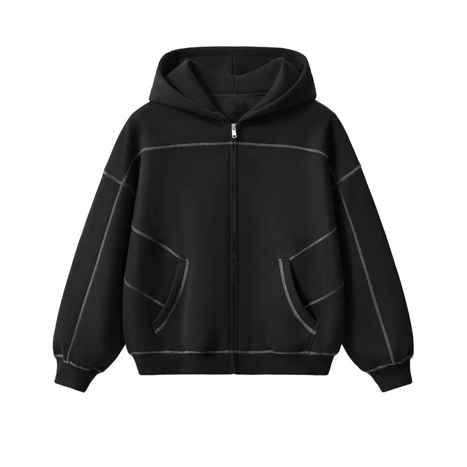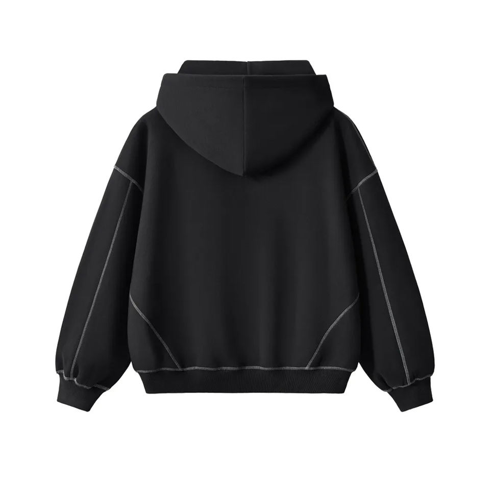 เสื้อฮู้ดดี้สไตล์วินเทจทรงครอป แบรนด์ High Street ดีไซน์เฉพาะตัว ตกแต่งด้วยการเย็บแบบ Hasselblad ซิปหน้า ผ้าฟลีซคอตตอน ทรงบ็อกซี่ รับผลิตแบบ OEM พร้อมปักโลโก้ 3 มิติ