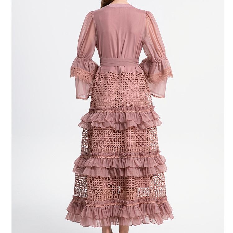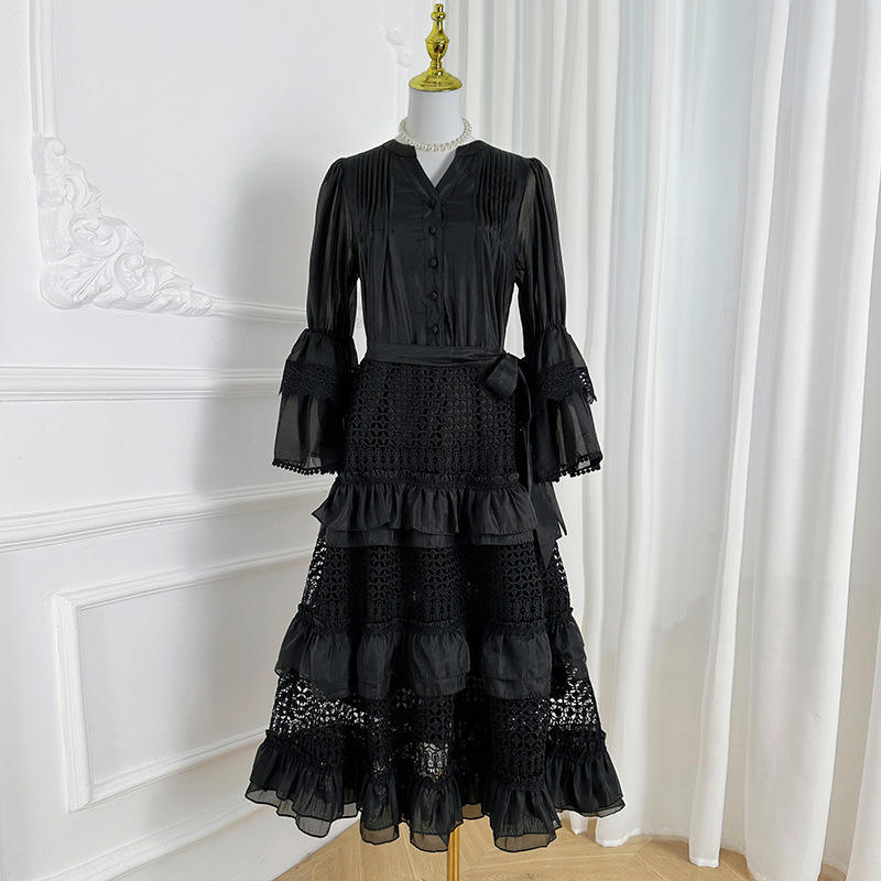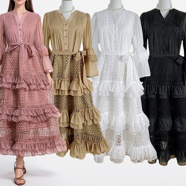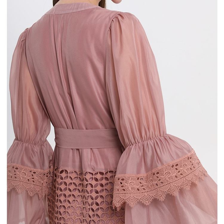 เดรสแฟชั่นเอวแขนบานมีระบายลายฉลุลูกไม้แบบประกบแนววินเทจ