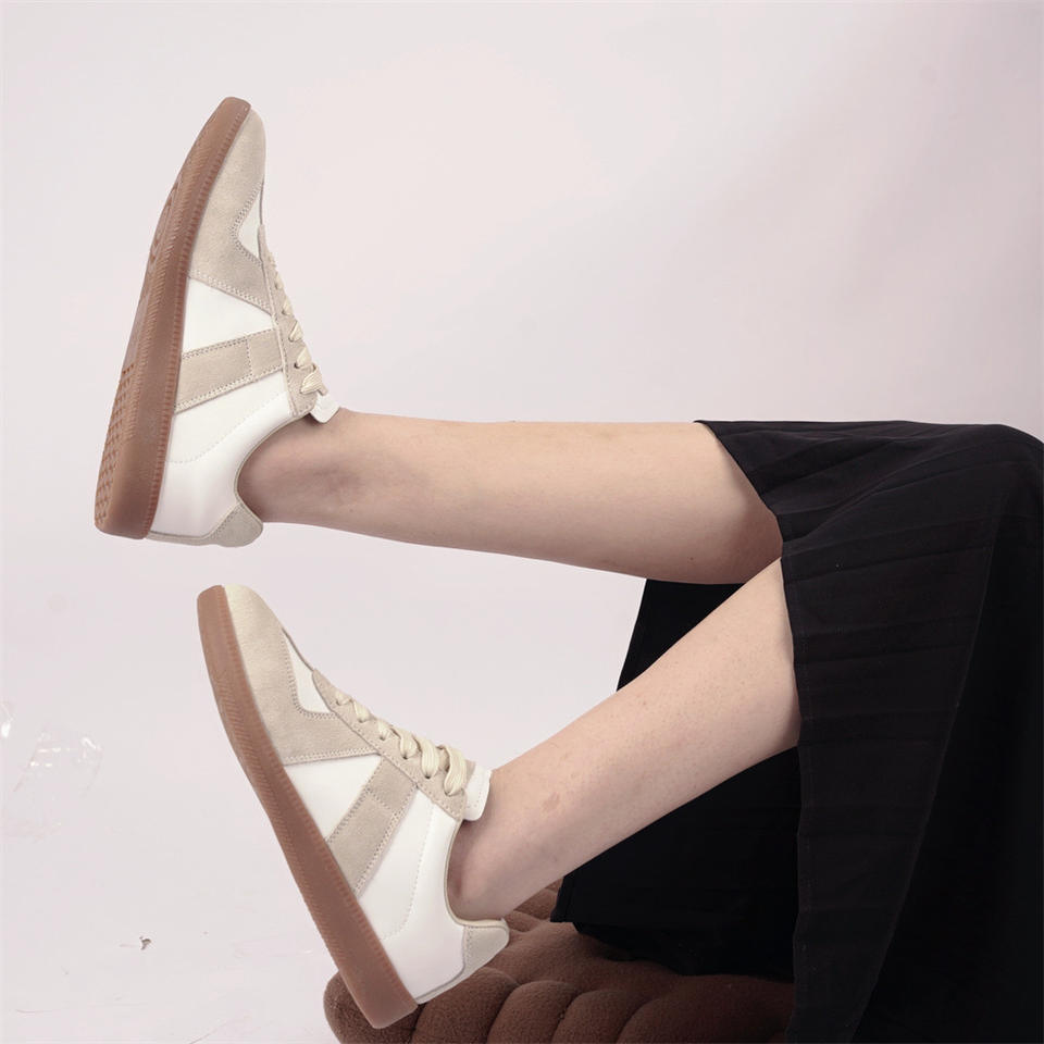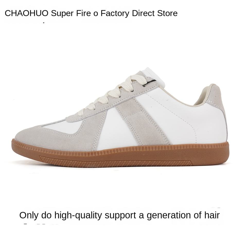 รองเท้าผ้าใบส้นเตี้ยหนังสีขาวสไตล์วินเทจของฮ่องกงรองเท้ากีฬาสำหรับเดินลำลองทุกฤดูดีไซน์ใหม่สำหรับผู้ชายผู้หญิง