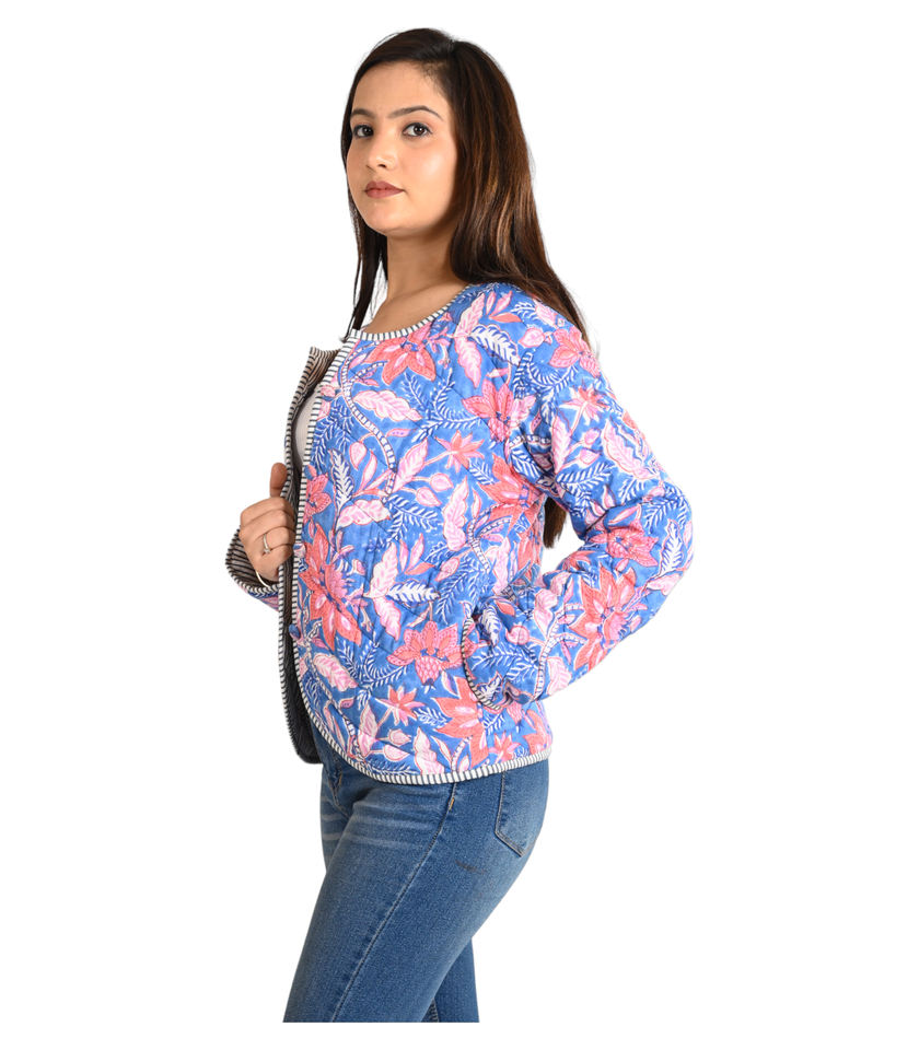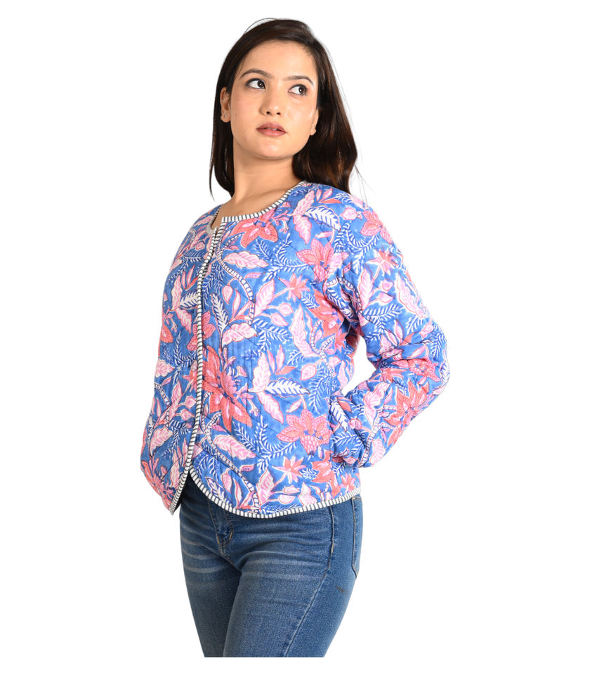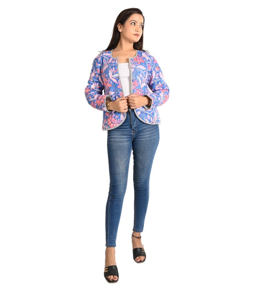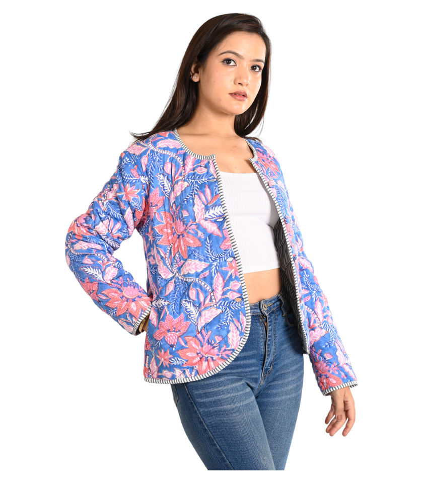 แจ็กเก็ตผ้าฝ้ายบุผ้าแคนต้าอินเดียวินเทจสำหรับผู้หญิงเสื้อโค้ทฤดูหนาวสั้นลายดอกไม้บล็อกด้วยมือ