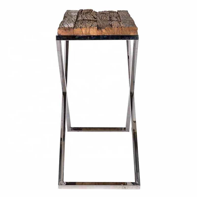 โต๊ะคอนโซลรถไฟอุตสาหกรรมแบบวินเทจพร้อมฐานสแตนเลสแบบไขว้