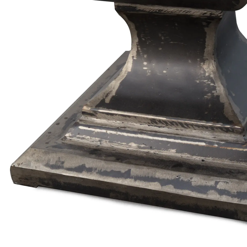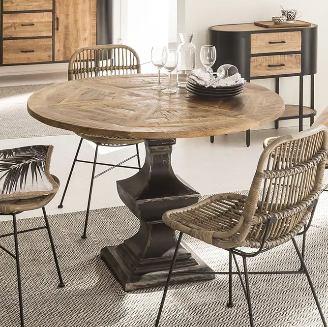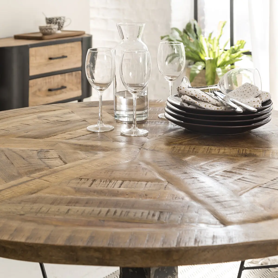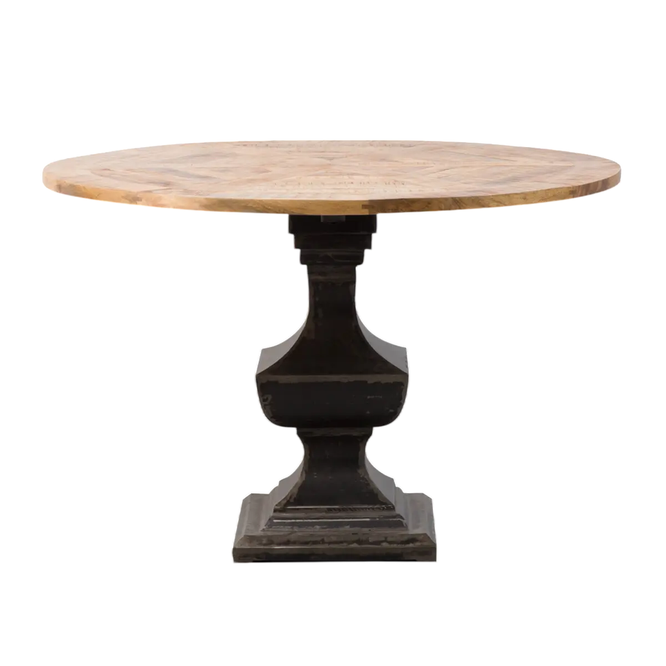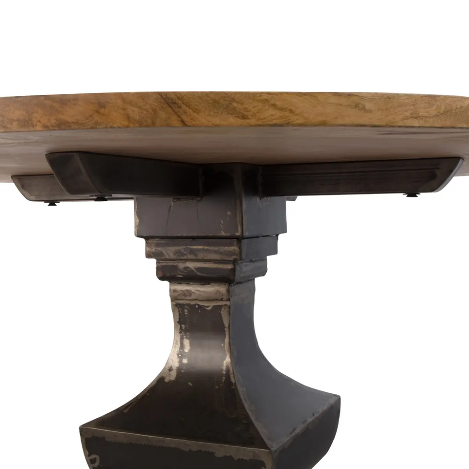 โต๊ะอาหารทรงกลมฐานตั้งแบบวินเทจสไตล์อินดัสเทรียล ทำจากไม้และโลหะคุณภาพสูง ดีไซน์ท็อปไม้มะม่วงแท้ลายเส้น