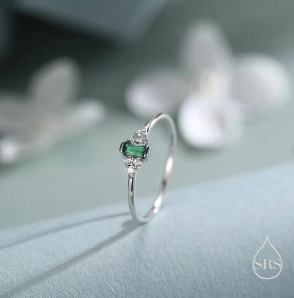 แหวนเงินแท้ทรงบาแก็ตต์ประดับมรกตสีเขียวมรกตขนาดเล็กสไตล์วินเทจ แหวนมรกตอันละเอียดอ่อน