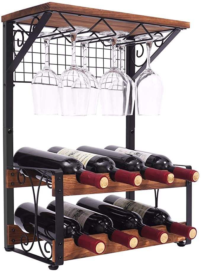 ชั้นวางไวน์เหล็กวินเทจพร้อมที่วางแก้วไวน์ ชั้นวางบาร์ติดผนังสำหรับตกแต่งบ้าน