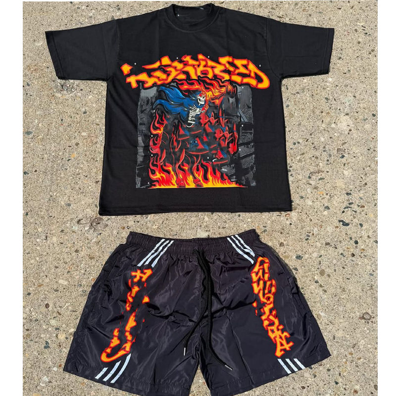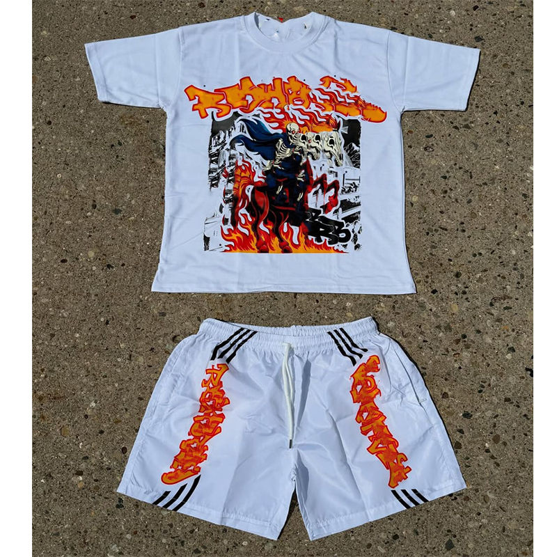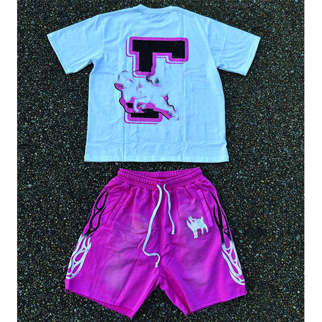 ชุดวอร์มผู้ชายสไตล์วินเทจ ผ้าฝ้ายเนื้อนุ่ม สีพื้น ใส่สบายสำหรับฤดูร้อน ระบายอากาศได้ดี ดีไซน์ประดับเพชรด้านหน้า เสื้อยืดและกางเกงขาสั้นแบบสั่งทำพิเศษ