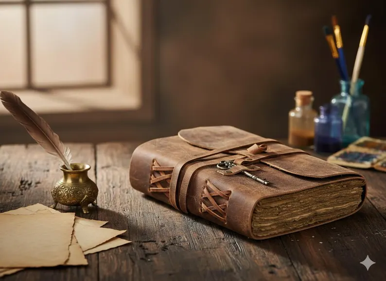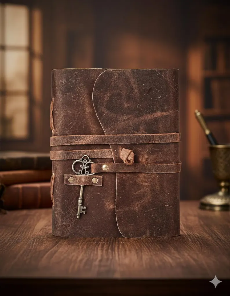 สมุดบันทึกหนังวินเทจพร้อมกุญแจโบราณ สมุดวาดเขียนกระดาษขอบดิบทำมือ สไตล์เรียบง่ายสำหรับวาดภาพและเขียน
