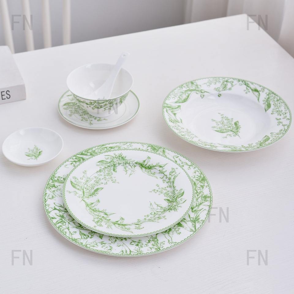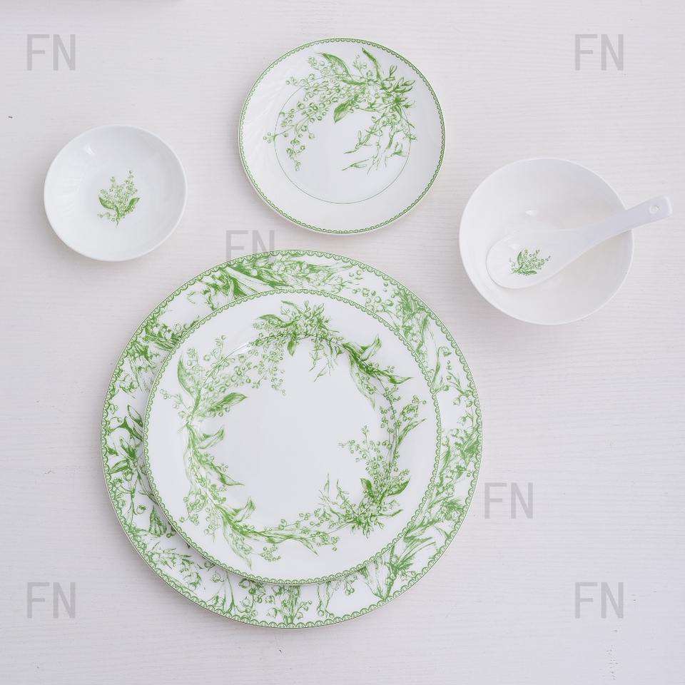 ชุดจานอาหารค่ำพอร์ซเลนลายดอกไม้สีเขียวอ่อนแนววินเทจ