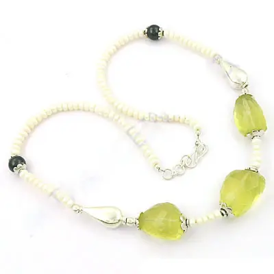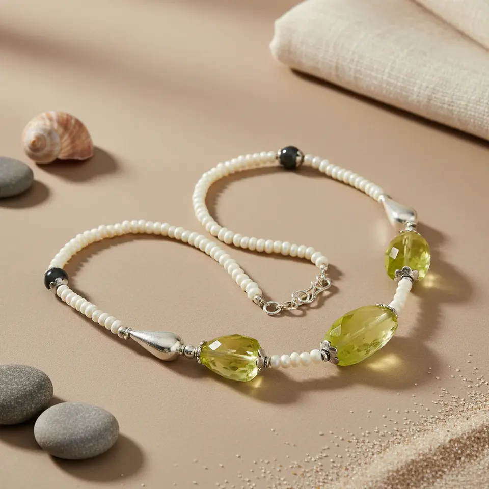 สร้อยคอมุกน้ำจืดสีเขียวมะนาววินเทจ-ชุบทอง 18K