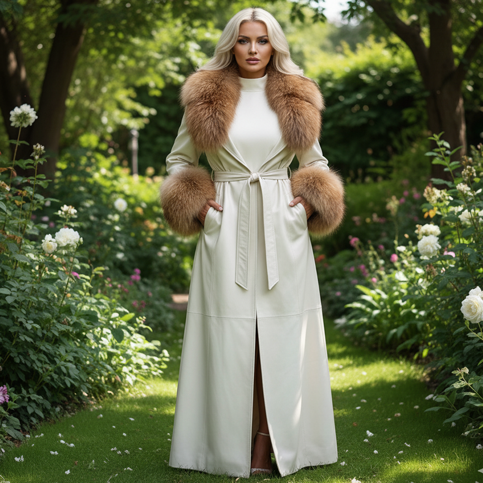 เสื้อโค้ทหนังปลาแบบยาวสไตล์วินเทจ ดีไซน์เข็มขัด พร้อมขนสุนัขจิ้งจอกสีน้ำตาล ขายส่ง เสื้อโค้ทเทรนช์ผู้หญิงสั่งทำพิเศษ ซับในผ้าไหมกันลม