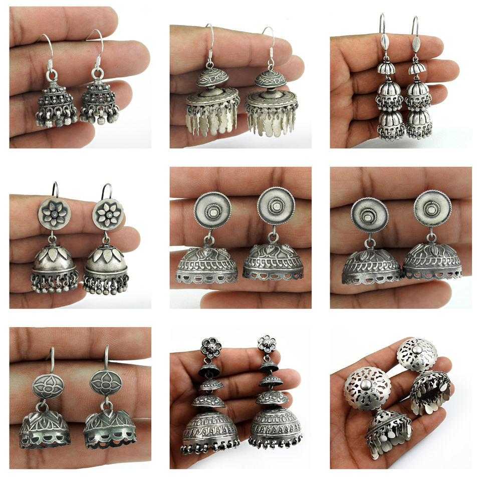 เครื่องประดับทำมือสไตล์วินเทจจากอินเดีย เงินแท้ 925 ชุบออกซิไดซ์ ประดับมุกธรรมชาติและทับทิม แกะสลักลายชาติพันธุ์ ต่างหูสำหรับผู้หญิง