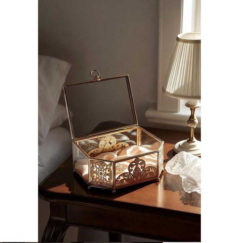 กล่องใส่เครื่องประดับทองเหลืองแก้ววินเทจหรูหรา ยี่ห้อ PN ARTWARE ฝาปิดแบบมีบานพับ ตกแต่งลวดลายสวยงาม กล่องโชว์แบบกำหนดเองได้ คุณภาพสูง