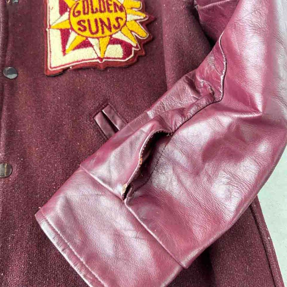 เสื้อแจ็กเก็ตมาร์ูนวาร์ซิตี้วินเทจแขนหนังย้อนยุคเลตเทอร์แมนบอมเบอร์มีแผ่นปะปักลายวินเทจ