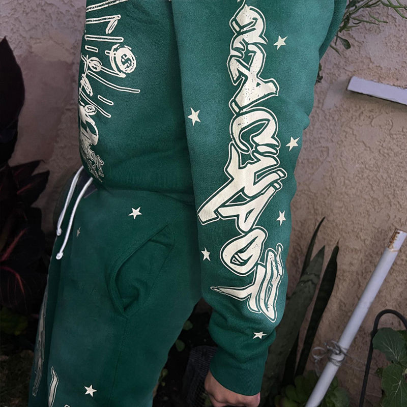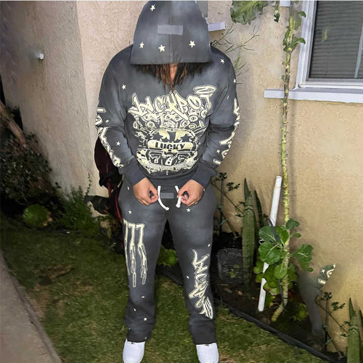 ชุดวอร์มวินเทจผู้ชาย ปักลายแบบดิสเทรส ชุดสเวตเชิ้ต 500 กรัม เสื้อฮู้ดซิป แจ็คเก็ตยีนส์ฟอกสี กางเกงจ็อกเกอร์ขายาวทรงตรง ชุดวอร์ม