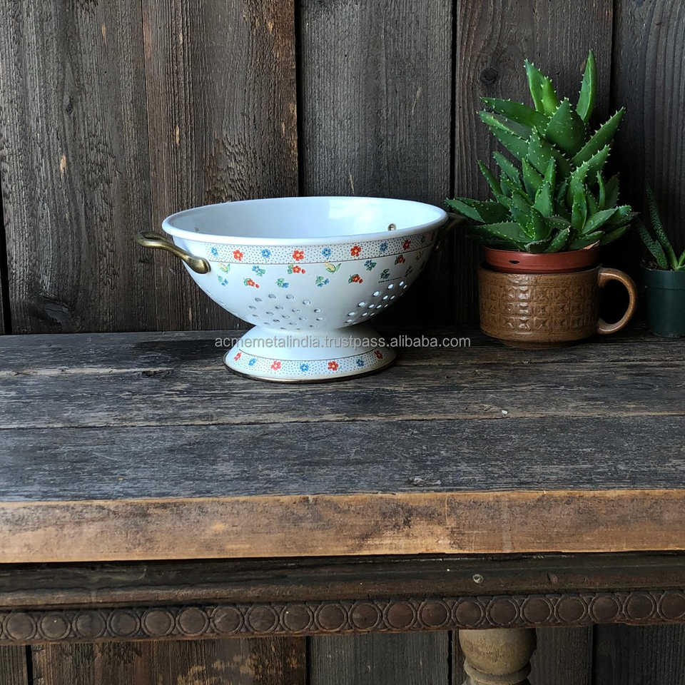 กระชอนโลหะเคลือบลายดอกไม้โบราณ สไตล์วินเทจกลางศตวรรษ อุปกรณ์ครัวสำหรับกรองผลไม้ กระชอนขนาดเล็ก