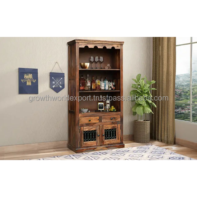ตู้บาร์ไม้มะม่วงและหนังสไตล์วินเทจกลางศตวรรษ พร้อมลิ้นชักและชั้นวางของไม้เนื้อแข็ง สำหรับเก็บเหล้าและไวน์ เหมาะสำหรับโรงแรมและบ้าน
